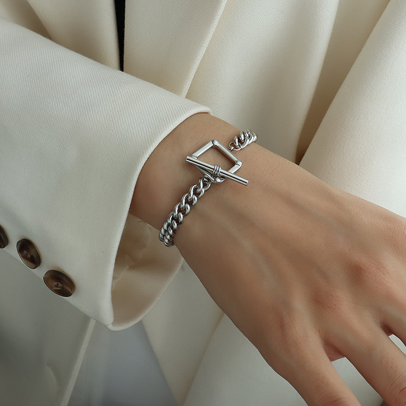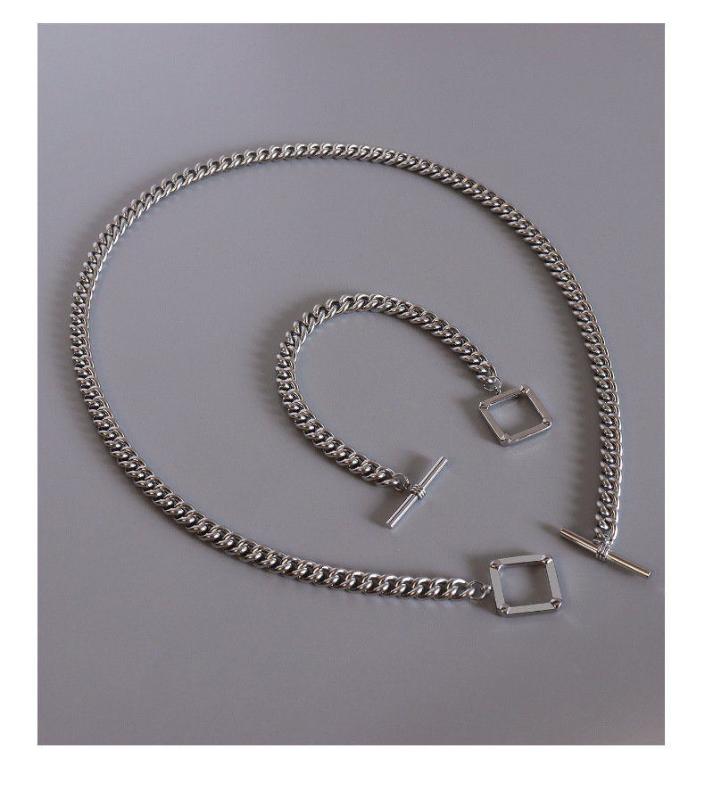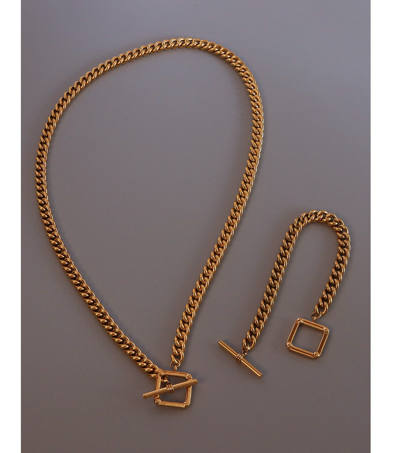 A statement set that has some features. OT buckle structure makes it pretty easy to put on and take off. The chunky chain outlook presents a hardcore rocky style. Spice up your daily outfit!